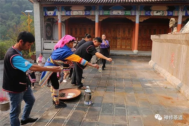 茶农们按当地习俗,恭敬的供奉祭品,燃香,奉茶。在庄严的仪轨中,禅茶师们绕行圣像、供香、供茶。用玻璃质地的公道杯供茶时,冰岛之邦的资深茶人吕红老师引导大家观看杯中倒映出的神农圣像。金色的茶汤,倒映着白色的圣像,清晰传神。听着吕老师的生动解说,大家赞叹不已。